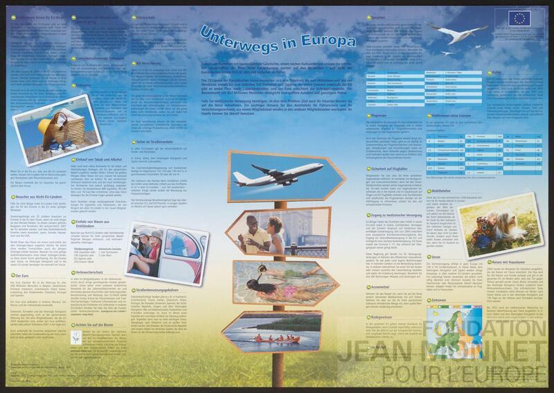 L’affiche représente de nombreux textes sur le voyage, un panneau dans une plaine représentant quatre images liées aux vacances ainsi que trois photos et une carte de l’Europe