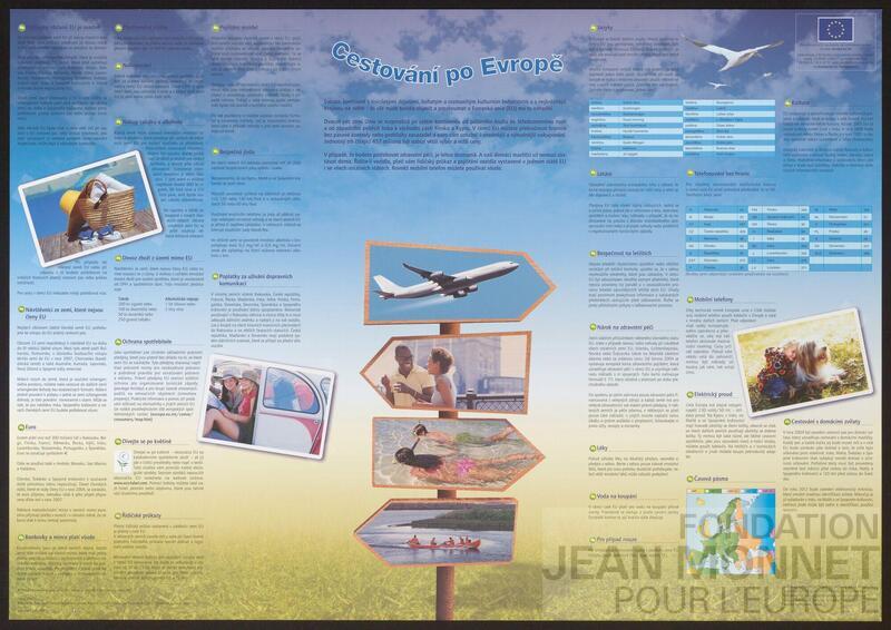 L’affiche représente de nombreux textes sur le voyage, un panneau dans une plaine représentant quatre images liées aux vacances ainsi que trois photos et une carte de l’Europe