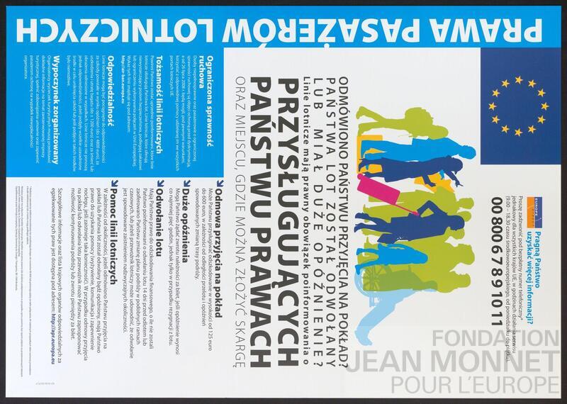 L’affiche représente les silhouettes colorées de plusieurs personnes ainsi que différents textes concernant les droits des voyageurs