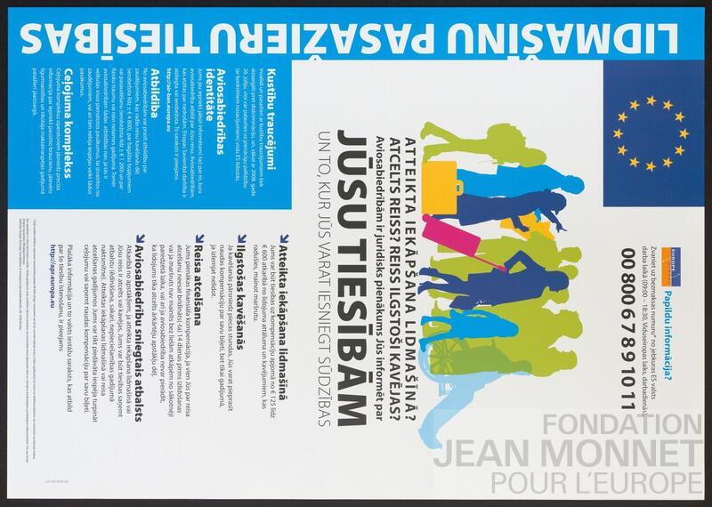 L’affiche représente les silhouettes colorées de plusieurs personnes ainsi que différents textes concernant les droits des voyageurs