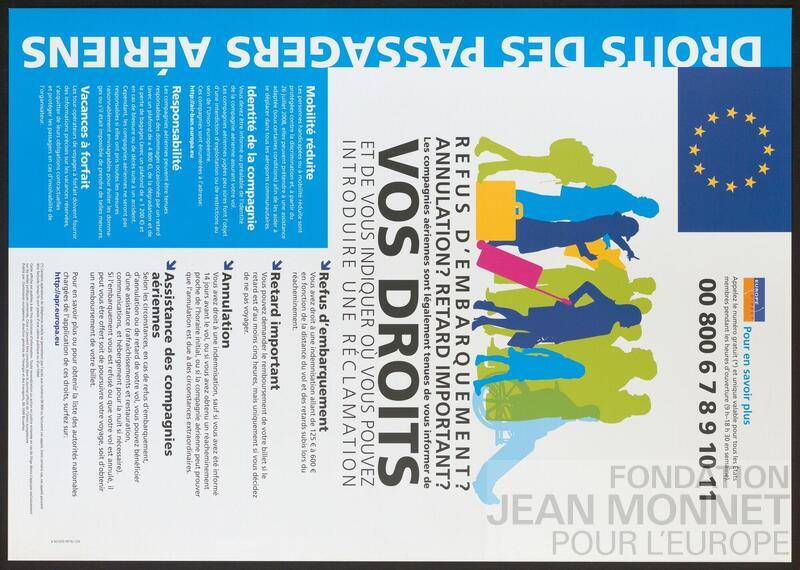 L’affiche représente les silhouettes colorées de plusieurs personnes ainsi que différents textes concernant les droits des voyageurs