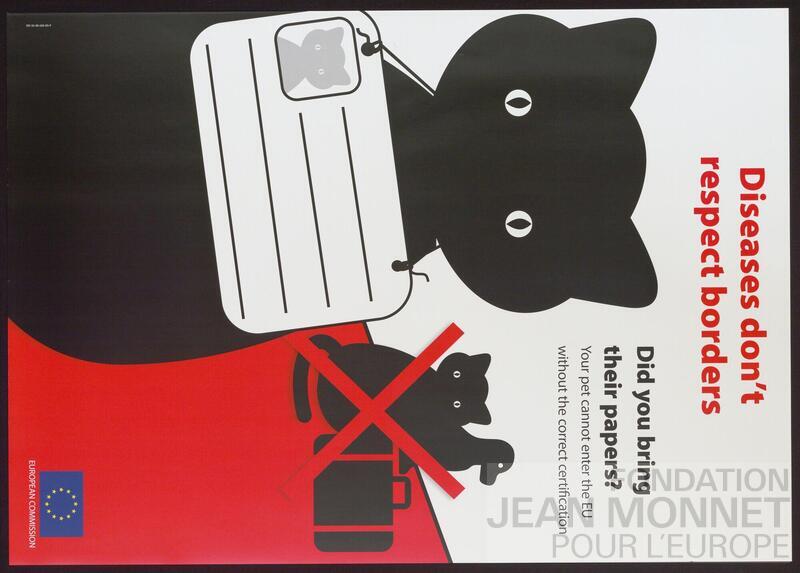 L’affiche représente un chat avec une carte d’identité ainsi qu’un chat, un chien et une valise