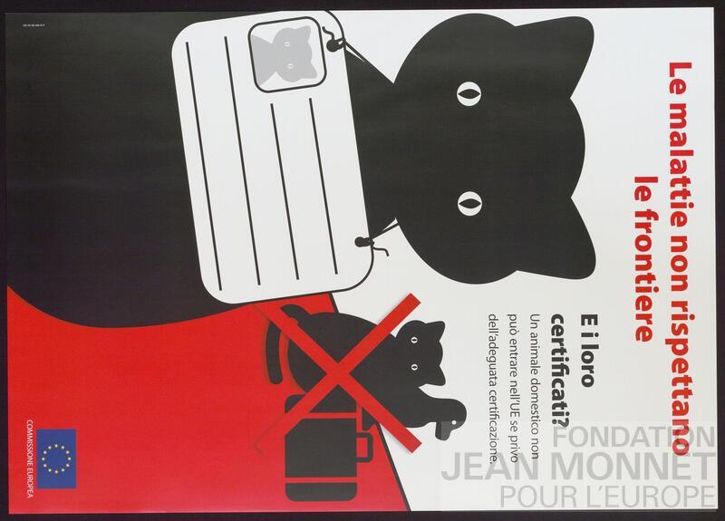 L’affiche représente un chat avec une carte d’identité ainsi qu’un chat, un chien et une valise