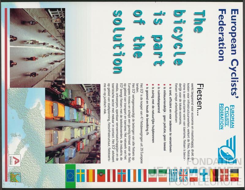 L’affiche représente les photos de voitures et de personnes assises sur la route, la carte de l’Union Européenne ainsi que ses drapeaux