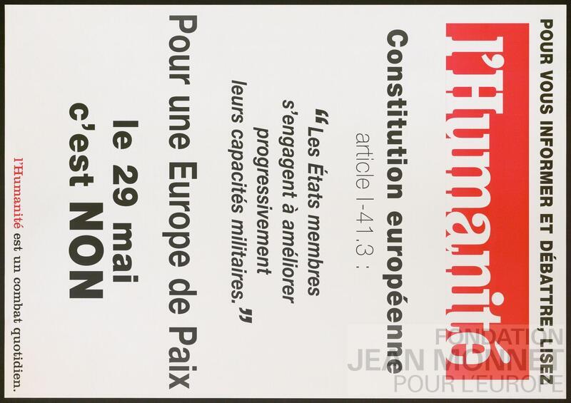L’affiche représente le logo du journal l’Humanité et un extrait d’un article de la Constitution européenne