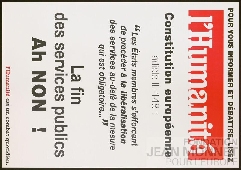L’affiche représente le logo du journal l’Humanité et un extrait d’un article de la Constitution européenne