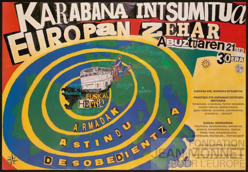 L’affiche représente une carte de l’Europe avec des bus, des soldats et le Pays basque