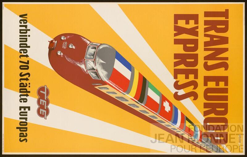 L’affiche représente un train avec les drapeaux de différents pays européens