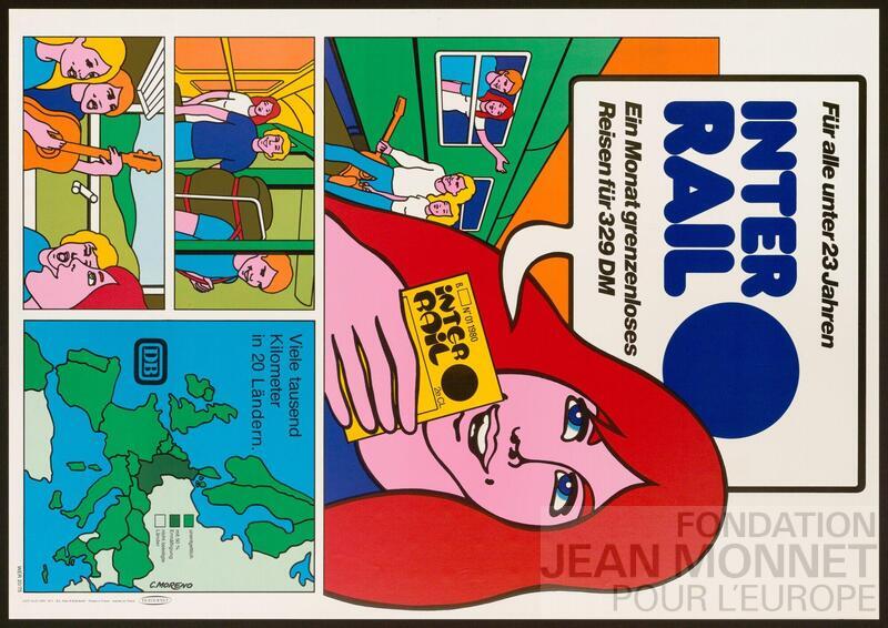 L’affiche représente une carte de l’Europe et plusieurs images sous forme de bande dessinée de jeunes dans un train