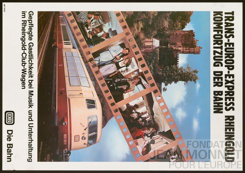 Promotion des Trans-Europ-Express. Le Rheingold I – L’Or du Rhin, une probable référence à l’opéra de Richard Wagner – faisait partie du réseau de train première classe Trans-Europ-Express et reliait Amsterdam, Genève, Zurich, Coire et Milan. Le Rheingold II reliait quant à lui Amsterdam à Munich (Source: Wikipédia, consulté en ligne le 21 janvier 2026). Date de publication incertaine basée sur la mention 83 en bas à gauche de l'affiche