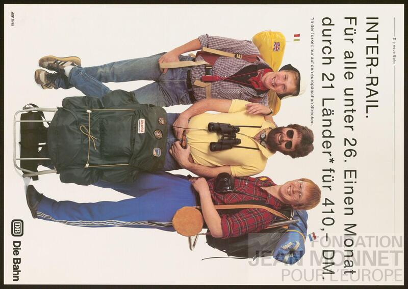 Promotion du pass Inter-rail. On peut noter que la Turquie est ici intégrée à l’offre InterRail comme faisant partie du réseau européen. Date de publication incertaine basée sur la mention 85 en bas à gauche de l'affiche